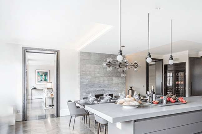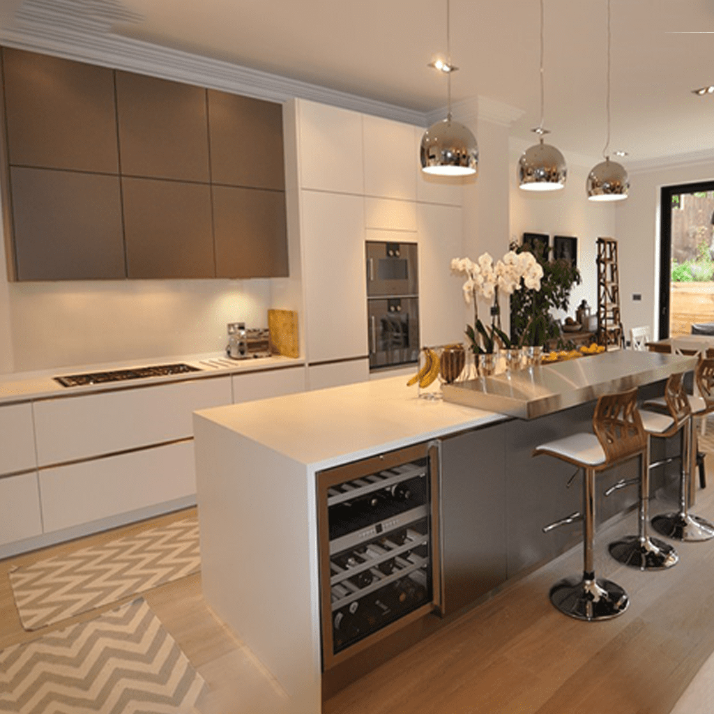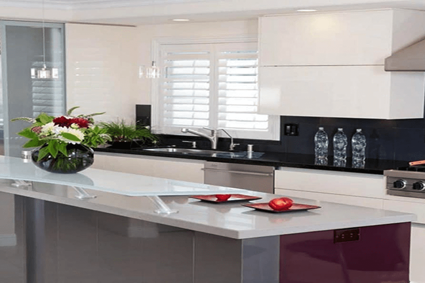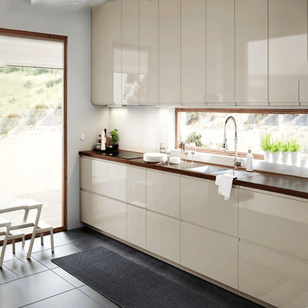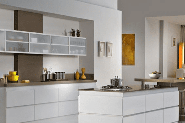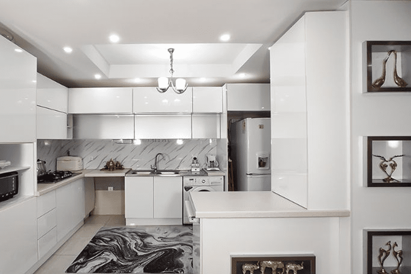 کابینت هایی که دستگیره ندارند و متریال انها هایگلاس است.کابینت هایگلاس سفید باعث میشود آشپزخانه پرنور به نظر برسد و برای آشپزخانه های کوچک بسیار مناسب است.