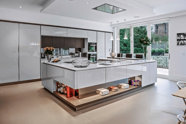 در این تصویر نمایی از کابینت آشپزخانه مدرن از جنس هایگلاس سفید برای آشپزخانه بزرگ و زیبا. کابینت ها در این آشپزخانه دستگیره ندارند و اپن جزیرهای که طراحی به شکل U دارد که در آن بخش هایی برای قرار دادن وسیله های تزئینی قرار داده شده است.
