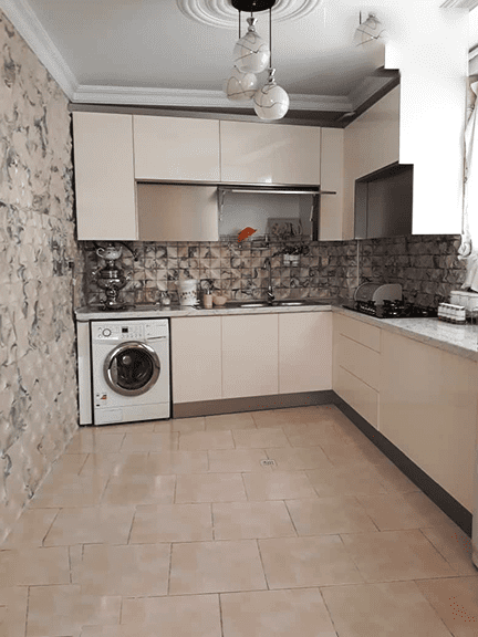 در این مدل کابینتها کامل سفید نیست و مایل به کرم است شما میتوانید با ماشین لباسشویی سفید که در عکس است مقایسه کنید. برای این آشپزخانه از گاز رومیزی استفاده شده است که یک انتخاب مناسب برای آشپزخانه هایی است که کوچک است.این مدل توسط کابینت سازان اوسا نجار اجرا شده است.